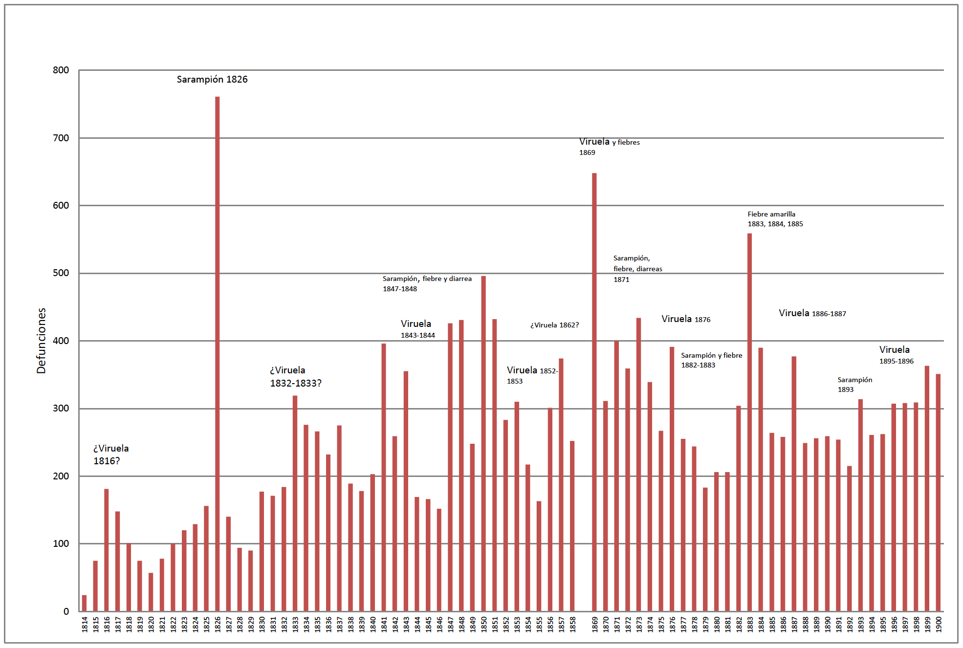 La serie de epidemias de viruela que se sufrieron en Sonora durante el siglo xix, motiva considerar que esta enfermedad se hizo endémica; pero esta idea debe ser matizada en el sentido de que significa que el orthopoxvirus podía estar presente en los sobrevivientes y que cuando hubiera una población lo suficientemente grande sin haberla experimentado, se volvería a presentar de forma epidémica.23 Lo anterior es necesario tenerlo presente porque el carácter endémico de la viruela en Sonora, durante el siglo xix, no se expresó en que fuera una enfermedad que estuviera presente de manera continua, cuando menos así lo parece indicar que no aparecen registros de defunción por esta enfermedad más que en los años epidémicos.24