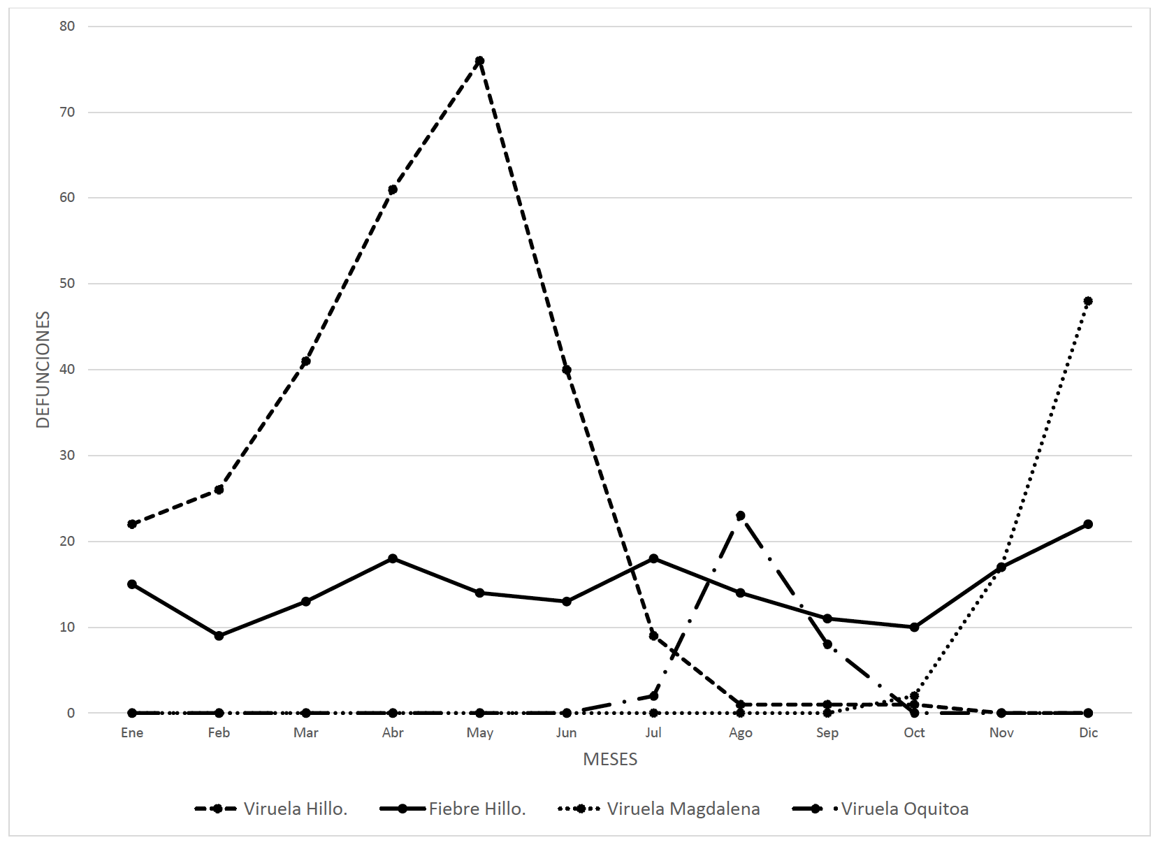En el cuadro anterior se anotan las fechas de la primera y última defunción por viruela en diferentes lugares del occidente, norte y noroeste de México. Como se puede apreciar, en Sonora, las muertes atribuidas a la epidemia de viruela de 1869-1870 iniciaron en enero del primer año, cuando se registró el primer difunto en la ciudad de Hermosillo. Sin embargo, la revisión de fuentes bibliográficas y de registros de defunciones permite observar que en Guadalajara hubo un brote epidémico entre enero de 1865 y enero de 1866. En Sombrerete, Zacatecas, se registran las primeras defunciones en febrero de 1865 y las últimas en abril de 1866; en Durango, las primeras defunciones empiezan en agosto de 1865 y las últimas un año después; en Chihuahua, aparecen registros de muerte por viruela en febrero de 1867 y se prolongan hasta mayo de 1868. De manera similar en Culiacán aparecen los primeros difuntos en agosto de 1867. Finalmente, en Hermosillo, Sonora, aparece el primer difunto en enero de 1869 y desde ahí se expande al resto del estado. De tal manera que las fechas de las primeras defunciones por viruela, en lugares vinculados por vías de comunicación con Sonora, sugieren que el virus llegó al estado mencionado, ya fuera por los caminos de herradura que comunicaban con Chihuahua o, por mar, al puerto de Guaymas desde algún lugar de la costa del Pacífico.