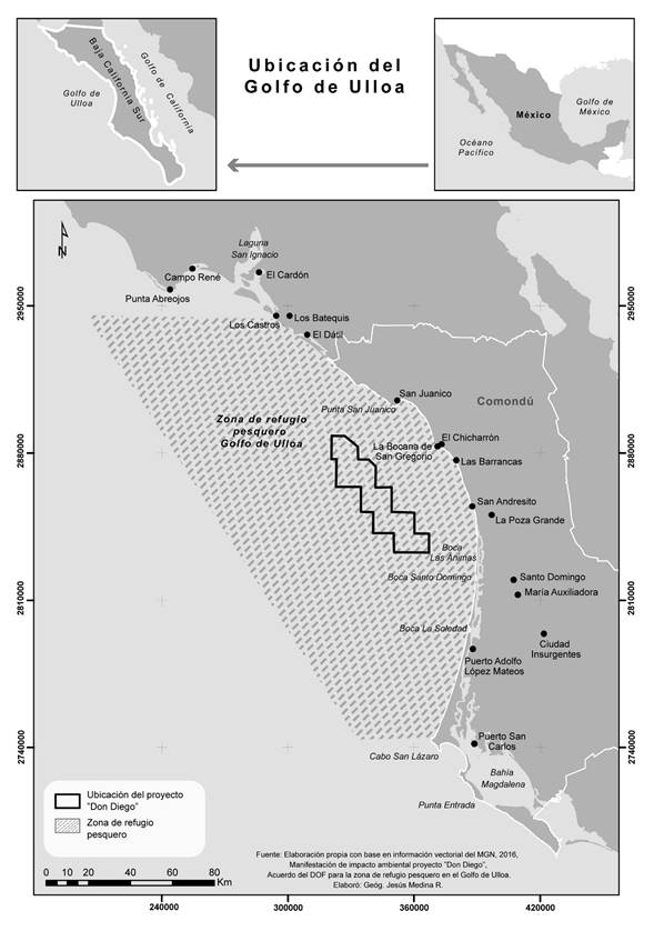 Fuente: elaboración propia con base en información vectorial del MGN, 2016. Manifestación de impacto ambiental proyecto "Don Diego". Acuerdo del DOF para la zona de refugio pesquero en el Golfo de Ulloa. Elaboró: geógrafo Jesús Medina R.