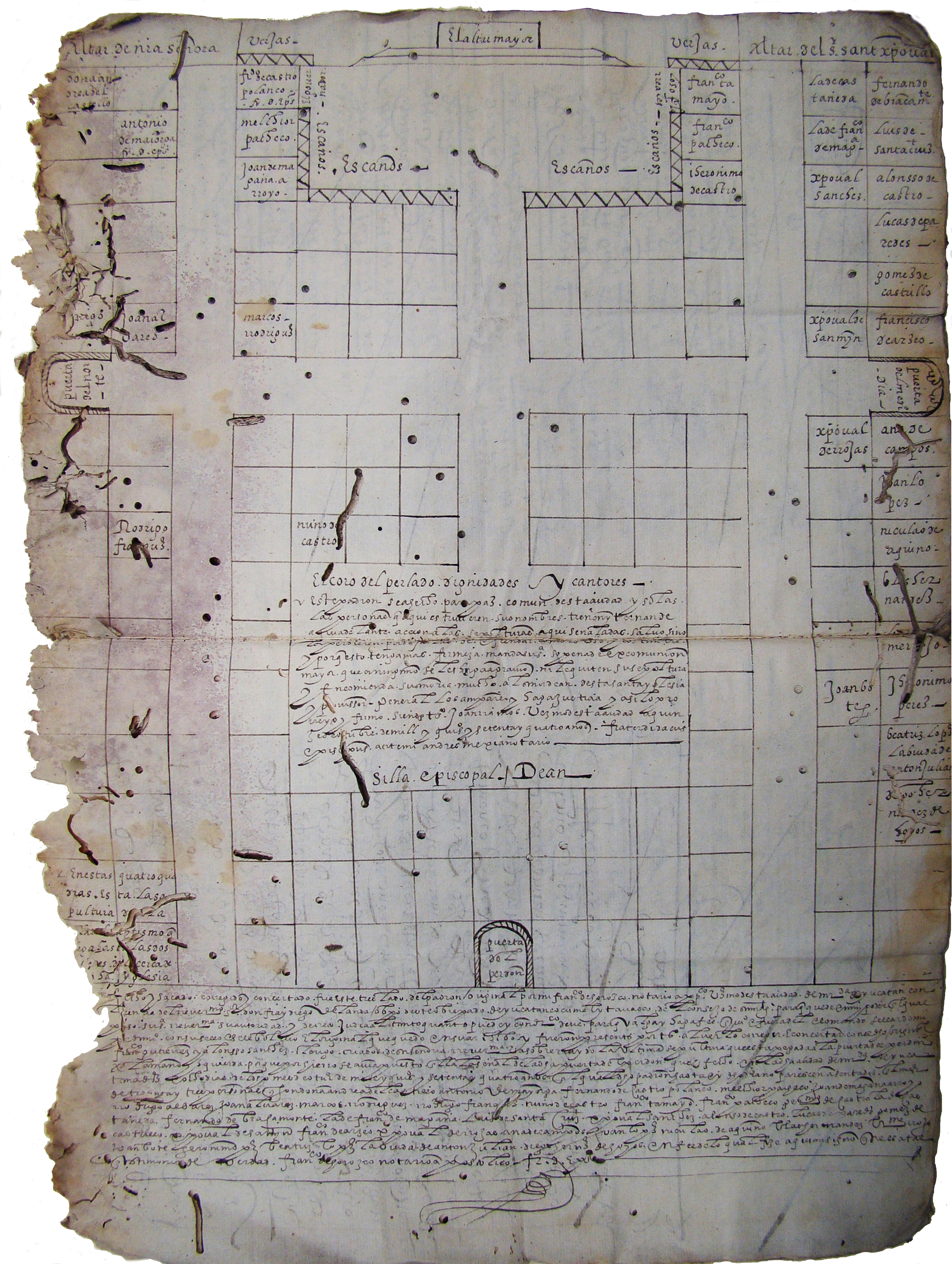 El coro del perlado, dignidades, y cantores./ Este padrón se ha hecho para paz común de esta ciudad y solas /las personas que aquí estuvieren sus nombres, tienen y tendrán de /aquí adelante, acción a las sepulturas aquí señaladas, salvo sino /la perdieren por dejarlas de ofrendar, como es uso y costumbre. /Y porque esto tenga más firmeza, manda su señoría so pena de excomunión /mayor, que ha ninguno se les haga agravio, ni le quiten su sepultura, /y encomienda su señoría mucho al señor dean de esta santa iglesia, /y provisor general, los ampare y haga justicia, y así lo pro/veyó y firmó siendo testigos Joan Ramos, vecino de esta ciudad, a quin/ce de octubre de mil y quinientos setenta y cuatro años, frater didacus /episcopus, ante mí, Andrés Mexia, notario. /Silla episcopal/deán.