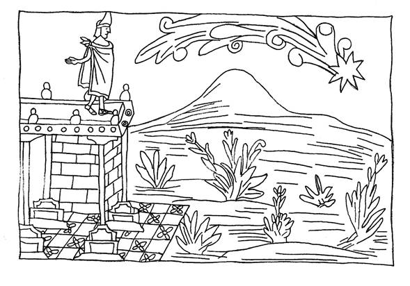 Un fenómeno totalmente inusual fue el que ocurrió diez años antes de la llegada de los españoles, que consistió en una pirámide de fuego de base ancha, que se originaba en el suelo después de media noche por el oriente, y se iba angostando al llegar al cielo hacia el occidente. Ésta salía con tanto resplandor que parecía de día; y cuando llegaba la mañana se perdía. Durante un año apareció cada noche y comenzó en el año 12 calli (“casa”) (figura 3). Éste fue llamado mixpanitl o mixpantli y tlemiahuatl.106 107