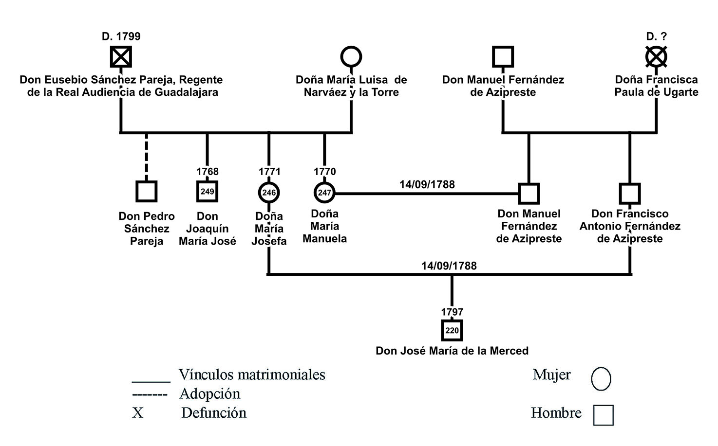 52 Las dos hijas de Sánchez Pareja casaron en la ciudad de México el 14 de septiembre de 1788 en la Parroquia de la Asunción del Sagrario Metropolitano con los hijos del matrimonio habido entre Don Juan Manuel Fernández de Azipreste y doña Francisca Paula de Ugarte, difunta al momento del enlace. Éstos eran Manuel Fernández de Azipreste Ugarte que casó con María Manuela, y Francisco Fernández de Azipreste que casó con María Josefa y en 1797 tuvieron a José María de la Merced. Family Search: Ciudad de México, Parroquia: Asunción Sagrario Metropolitano (centro), Matrimonios Españoles: 1769-1779, 1780-1781, 1785-1791, Imagen: 741 de 791, Acta de Matrimonio de Manuel Fernández de Azipreste y María Manuela, hija legítima de Eusebio Sánchez Pareja y María Luisa Narváez y la Torre, 14 de septiembre de 1788.