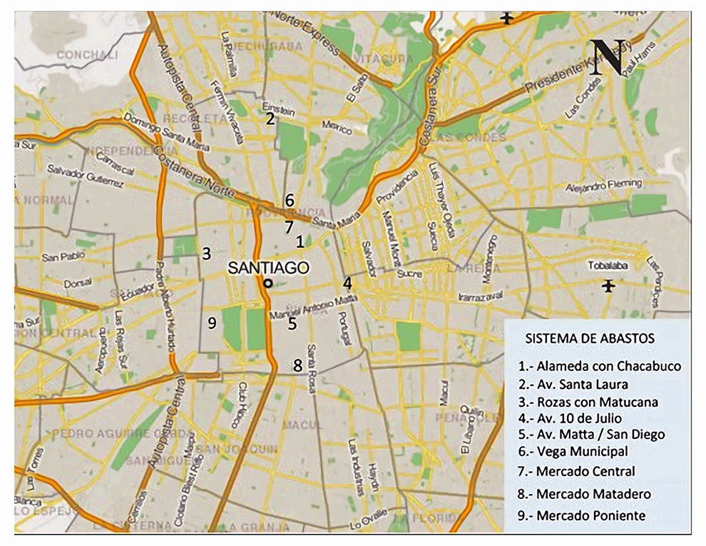 Mapa 1. Sistema de abastos de la ciudad de Santiago. Década de 1930