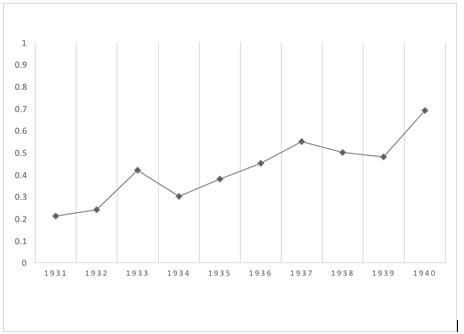 La exportación de papas tuvo efectos perjudiciales para el stock disponible en la Vega Municipal, disminuyendo progresivamente sus entradas de 354,000 sacos de 80 kilos en 1931 a 261,000 en 1935.19 De esta forma, y pese a eventuales aumentos de producción, el precio de las papas se mantuvo al alza durante toda la década de 1930, lo que obligó a la Municipalidad de Santiago a denunciar en el Comisariato de Subsistencia y Precios a los especuladores, dentro de los cuales se encontraban los consignatarios que reducían, como se dijo anteriormente, su venta en remate público.20 Como lo muestra la gráfica 2, su precio pasó de $0.21 en 1931 a $0.69 en 1940, con un aumento cercano al 300 % en diez años.