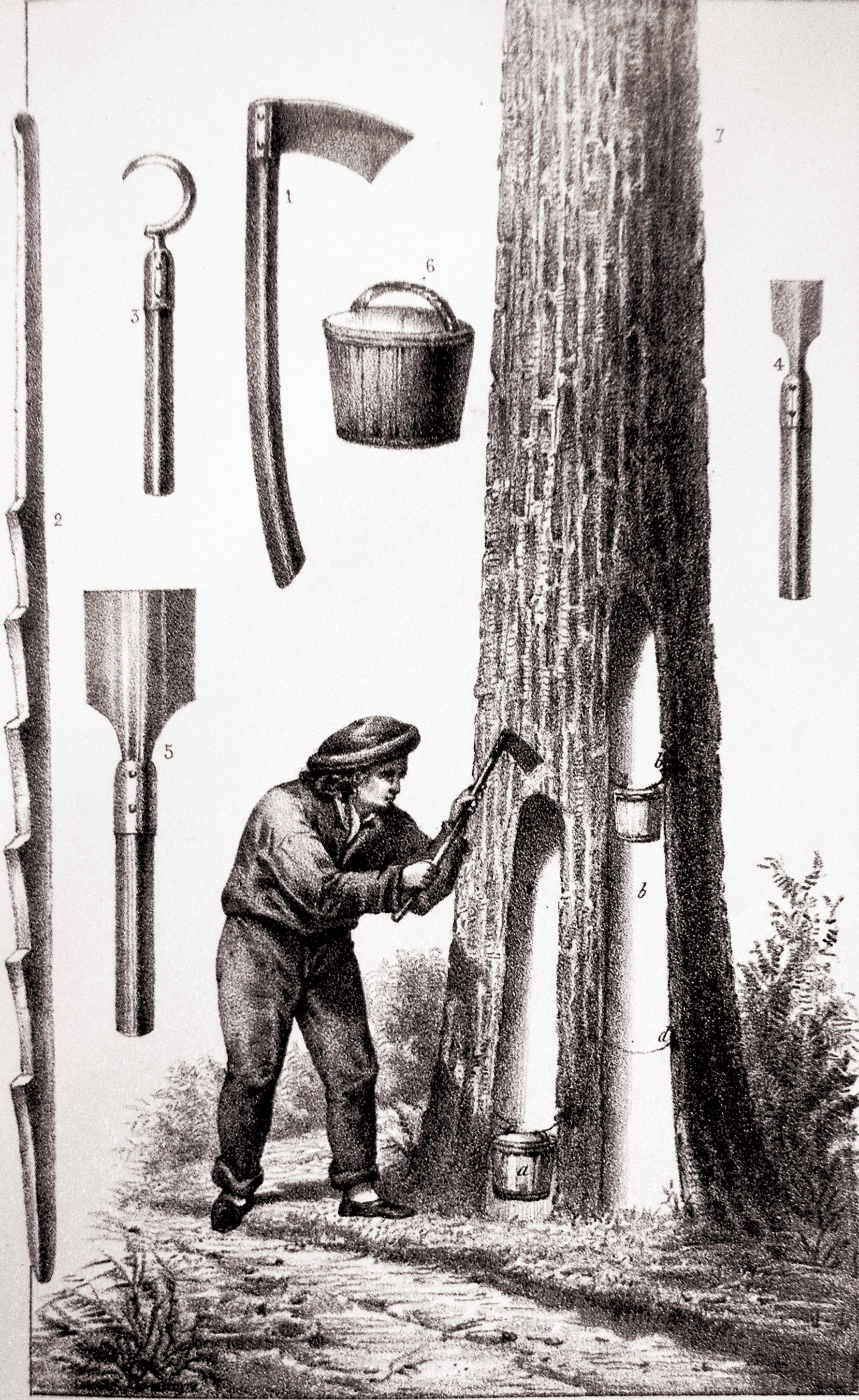 En 1840, el escritor francés Théophile Gautier (1811-1872) realizó un viaje a España. En su camino desde París pasó por Burdeos para luego internarse en las Landas de Gascuña antes de cruzar los Pirineos. La conmoción que le causó el paisaje landés fue enorme, le pareció lamentable el aspecto que presentaban los pobres pinos heridos, degollados, que levantaban sus brazos al cielo para demandar justicia (Gautier 1879, 13). La misma sensación se llevan, casi sin excepción, quienes hoy en día recorren por primera vez un pinar destinado a la extracción de su resina. La técnica para provocar la secreción parece a los ojos del neófito un crimen hacia el árbol, sin embargo, gracias a ella, la industria química ha podido consumir las clases demandadas de aguarrás y colofonia (principales derivados de la resina), los árboles han podido sobrevivir durante décadas permitiendo la renovación del bosque, y los habitantes de pinares han podido recibir un ingreso más o menos constante.