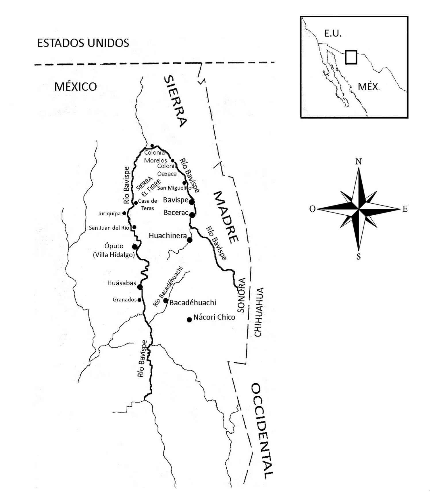 El río Bavispe es parte nodal de la cuenca del río Yaqui, pues constituye su afluente principal. Los escurrimientos que alimentan su cauce descienden de la Sierra Madre Occidental y, ya en Sonora, recibe agua de los arroyos Babidanchic y Huachinera. En el tramo inicial, el río escurre con dirección norte-noroeste y transita cerca de Huachinera, Bacerac, Bavispe, San Miguelito y las colonias Oaxaca y Morelos. Al llegar a la colonia Morelos se le suman las aguas del arroyo Batepito. En este punto alcanza su mayor altitud y modifica su dirección hacia el sur. Con este trayecto sus aguas fluían hacia el valle de Teras y la localidad Casa de Teras, hasta su inundación en 1941 por la construcción de la presa Lázaro Cárdenas o La Angostura (Evans 2006, 58). Después del valle de Teras el caudaloso afluente transcurría por los pueblos de Juriquipa, San Juan del Río, Óputo, Huásabas y Granados.8 Actualmente, el río Bavispe continúa fluyendo por estos pueblos, con un volumen controlado. Al dejar atrás Granados y tras recibir las aguas del arroyo Bacadéhuachi, el Bavispe confluye con el Aros y, en la confluencia, el cuerpo de agua comienza a denominarse río Yaqui, conservando este nombre hasta su desembocadura.9 Véase mapa 1.