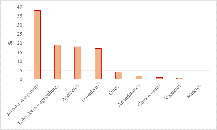 Es importante recordar que la redistribución de las tierras comunales, durante los siglos XVIII y XIX, produjo la pérdida de este recurso como medio de producción para los habitantes nativos y sólo “una minoría” pudo retener sus tierras, mientras la mayor parte “ingresó al trabajo asalariado o buscó una mínima seguridad como arrendatario o aparcero en propiedades privadas” (Radding 1997, 144, 192). La gráfica 2 muestra la distribución de identidades socioproductivas en los pueblos del Bavispe entre 1919 y 1937, con base en la información obtenida de los censos agrarios realizados en estos pueblos. Puede apreciarse que la agricultura era la actividad predominante de los pobladores, siendo los peones o jornaleros la identidad mayoritaria, seguidos por los labradores o agricultores y después por los aparceros. De acuerdo con Pérez (1983, 134), los jornaleros podían ser gambusinos, pues, “trabajaban por temporadas en la minería o en la agricultura”. También es evidente la importancia de la ganadería.