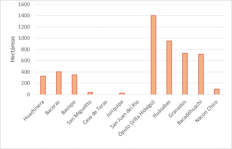 Como advertimos, los procesos de apropiación de las tierras de los pueblos originarios de Sonora, en particular de los ópatas, iniciaron durante el periodo colonial y continuaron y se acentuaron en periodos posteriores (Radding 1997, 191-195). Para Huachinera, Bacerac, Bavispe, Casa de Teras, San Juan del Río, Óputo, Huásabas y Nácori Chico, la documentación revisada ha permitido corroborar que la superficie de las propiedades privadas colindantes había formado parte de las tierras de estos antiguos pueblos (Padilla 2018, 18). En la gráfica 1 se advierte que los pueblos de Casa de Teras y San Juan del Río no tenían tierras de cultivo, adelante se explica por qué; asimismo, puede observarse que el área de cultivo es más extensa en los pueblos situados en el área occidental del cauce del Bavispe.