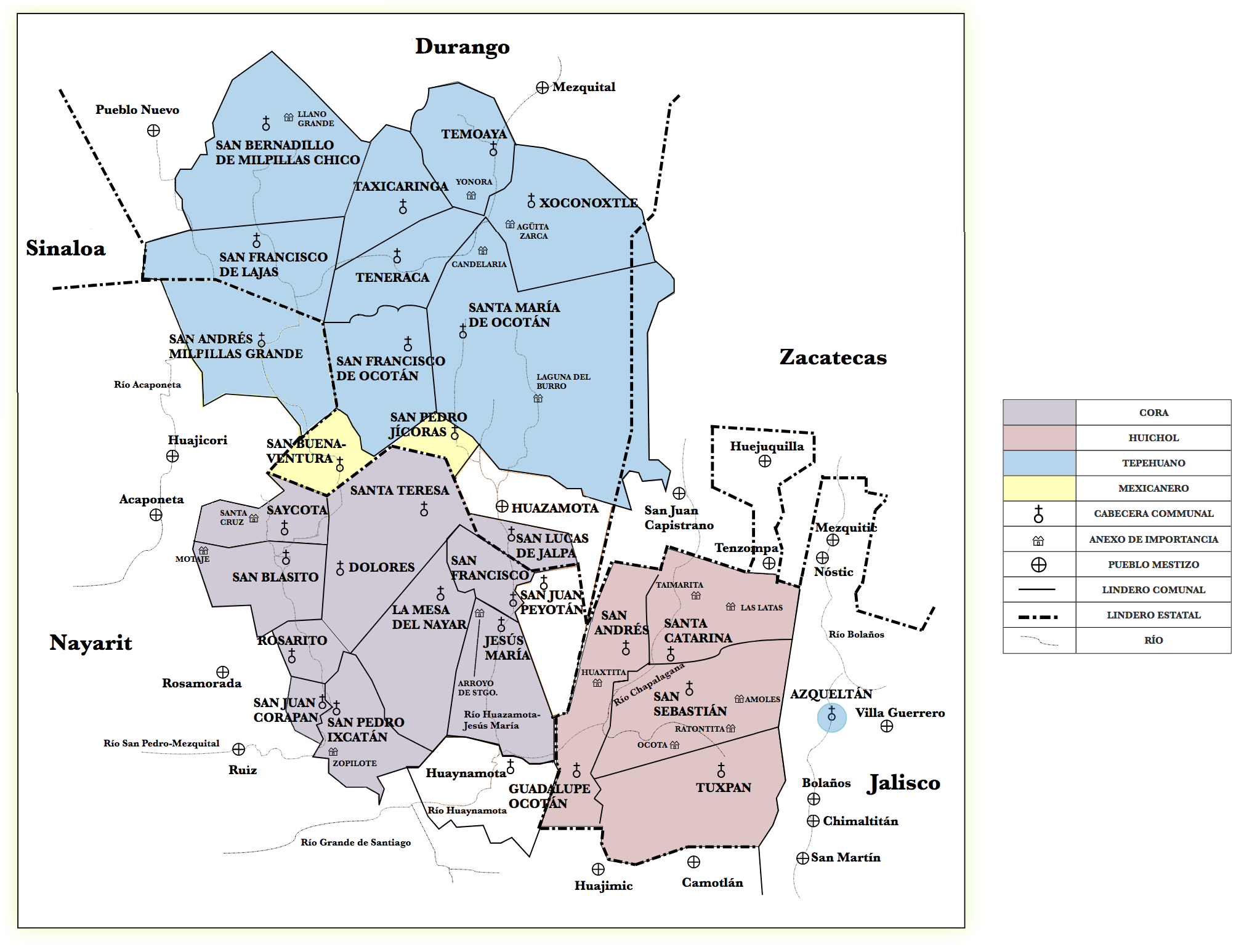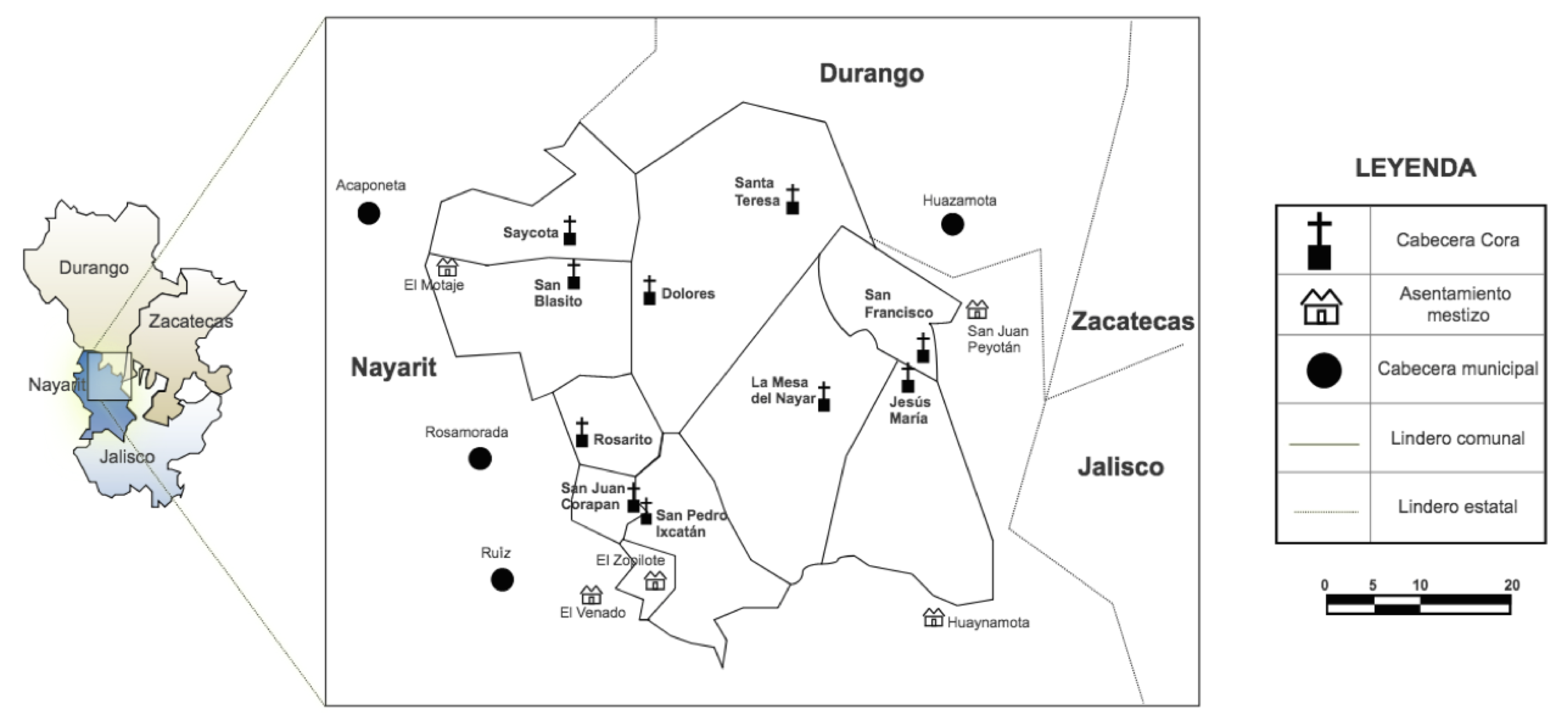 Desde el siglo XVI, hasta la época de la revolución, existían fuertes vínculos del “costumbre” entre las comunidades coras de la Sierra del Nayar. Estos enlaces rituales formaban la base de una visión de la identidad cora más amplia que la del grupo de parentesco o de la comunidad, que a su vez que hicieron posible la frecuente cooperación política y militar entre todas, en busca de fines comunes, como la preservación de la autonomía cultural y territorial. Pero durante la primera mitad del siglo XX, la llegada al poder local de caciques carrancistas, la política indigenista, agrarista y colonizadora del Estado mexicano y el crecimiento de la población regional mestiza asociado con esas políticas, promovieron la división de cada comunidad cora en facciones, y el desarrollo de conflictos territoriales entre las comunidades. Así se deterioraron los intercambios rituales coras y se fragmentó la idea de la territorialidad cora más allá de los territorios comunales.Citas