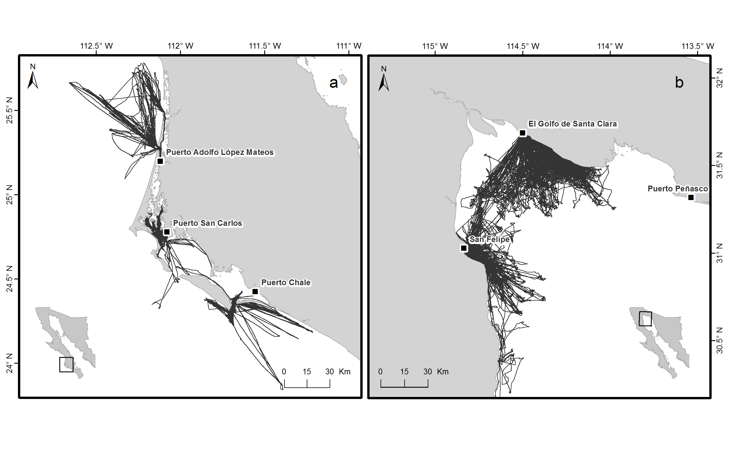 - Mapas de rutas de pesca para dos comunidades que participan en el Programa de Ciencia Ciudadana. a) Bahía Magdalena – Almejas; b) Alto Golfo de California]