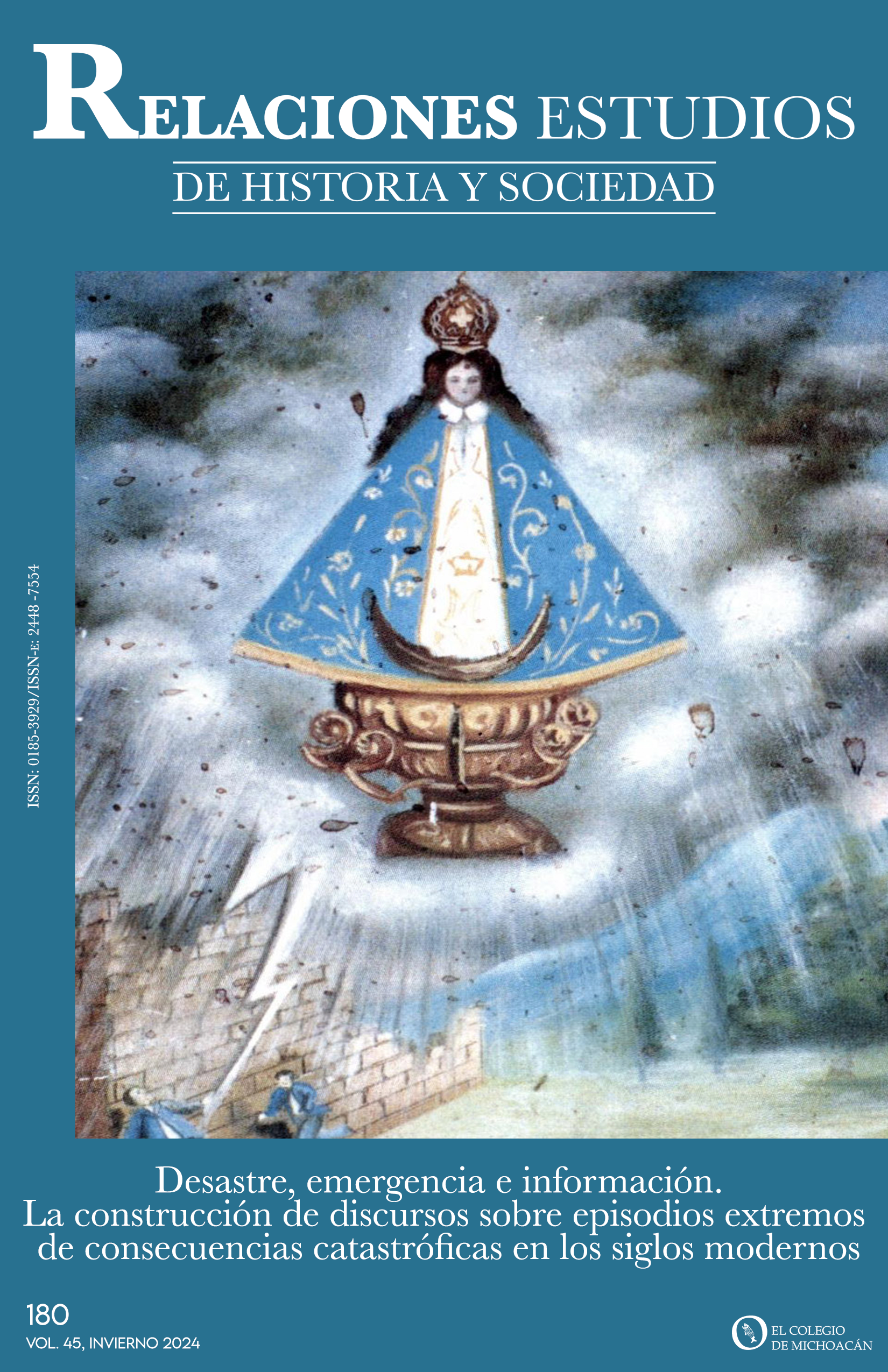 Vol. 45 Núm. 180 (2024)Créditos de portada: Ex voto de San Juan de los Lagos (1944) que muestra a un hombre alcanzado por un rayo en medio de una tormenta. Fuente: Marianne Bélard y Thomas Calvo, México en un espejo. Los exvotos de San Juan de los Lagos (1870-1945). México, UNAM, CEMCA, 2000.
