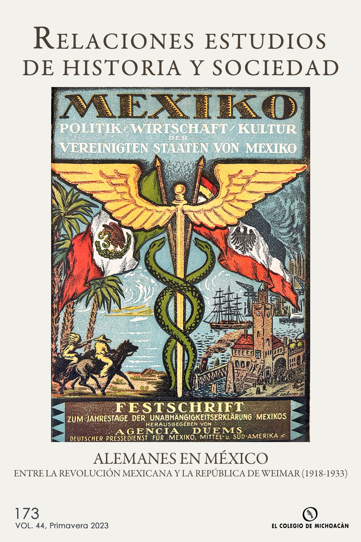 Vol. 44 Núm. 173 (2023)CRÉDITOS DE PORTADA: Portada del boletín conmeorativo Mexiko: Politik / Wirtschaft / Kultur der Vereinigten Staaten von Mexiko. Agencia Duems (1923)